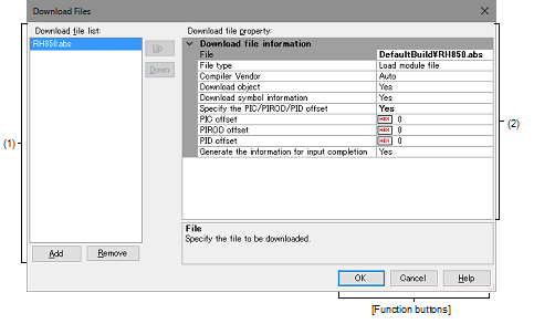 Displays a list of files to download. The names of files specified as build targets in a project (main project or sub-project) are displayed by default (they can be removed).