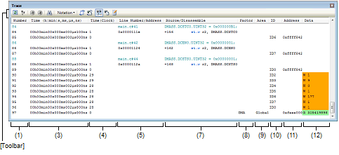 This panel is used to display trace data recording the execution history of the program (see "2.13 Collect Execution History of Programs").