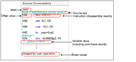 The corresponding instructions are displayed as the result of disassembling when the Mixed display mode or Disassemble display mode is selectedNote 2. |