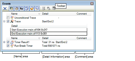 In CS+, these events are used as the action trigger of the debug function such as breakpoint, start/stop the tracing, and start/stop the timer.