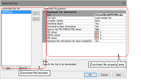 Select [Green Hills Software] in the [Compiler Vendor] property in the Download Files dialog box to add the load module file. |