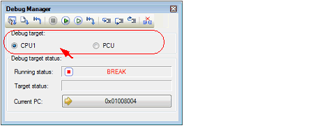 Select a desired PE on the Debug Manager panel that are opened by selecting [Debug Manager] from the [View] menu.