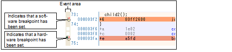 Within the Main area (Editor panel) or Event area (Disassemble panel) in which a valid address is displayed, click on the location where you want to set a breakpoint. A breakpoint whose type is being selected in the [First using type of breakpoint] property is set to the instruction at the start address corresponding to the clicked line.