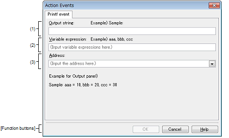 A Printf event momentarily stops the execution of the program at a specified location, and executes the printf command via software processing. When a Printf event is set, the program momentarily stops immediately before executing the command at the location where this event is set, and the value of the variable expression specified in this dialog box is output to the Output panel.