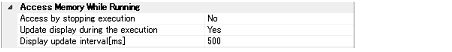 You can configure the memory access while executing a program (the real-time display update function) in this category. See "2.9.1.4 Display/modify the memory contents during program execution" for details on the real-time display update function.