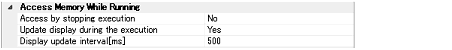 You can configure the memory access while executing a program (the real-time display update function) in this category. See "2.9.1.4 Display/modify the memory contents during program execution" for details on the real-time display update function.