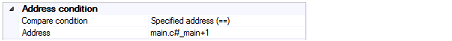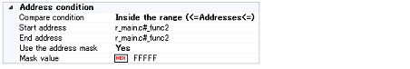 After selecting any of these conditions, directly enter an address expression as the address range in the [Start address] and [End address] field displayed under the list for selection of the type of comparison.