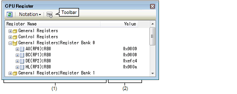The contents of the CPU register (general-purpose register/control register) can be shown and the value can be changed in the CPU Register panel below.