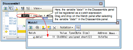 Select the character strings of C language variables/CPU registers/SFR/assembler symbols from an external editor and drag and drop it in the Watch panel (Watch 1 to Watch 4).