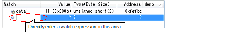 button in the toolbar in any the Watch panel (Watch1 to Watch4) to display the following entry box in the [Watch] area.