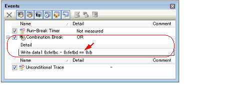 When you have performed the above operation, the set break event (access type) is managed in the Events panel as a Hardware Break event (access type) or a execution-related event in the detailed information on a Combination Break event (see "2.15 Manage Events" for details).
