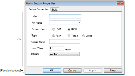 This property dialog box is used to set or change the pin connection information of buttons, which are one of the connection parts in the I/O Panel window.
