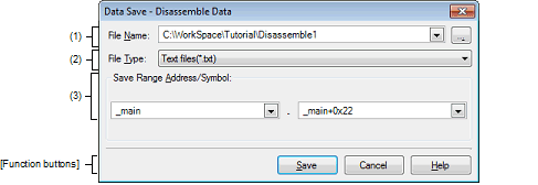 This dialog box saves the displayed contents of Disassemble panel, Memory panel or Trace panel and the upload data. (See "2.5.3 Executing an upload")