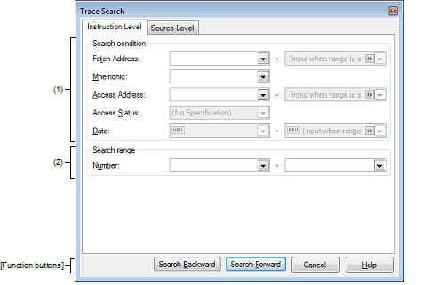 The character string specified here is searched from within the [Source/Disassemble] area of the Trace panel.