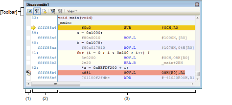 This panel displays the disassembled results of memory contents (disassembled text), as well as displays the results of line assemble (see "2.6.4 Performing line assembly"), instruction-level debugging (see "2.9.3 Execute programs in steps"), and code coverage measurements [Simulator] [E20 [RX71M and RX64M Groups]] (see "2.15 Measure Coverage [Simulator] [E20 [RX71M and RX64M Groups]]").