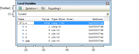 This panel displays the contents of local variables and changes their values (see "2.11.5 Displaying and changing local variables").