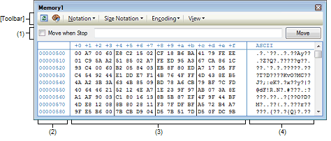 To specify the display notation, display width of memory values, and the number of view columns, use the toolbar buttons or select [Notation], [Size Notation], and [View] from the context menu, respectively (see “2.11.1.2 Changing the display form of values“).