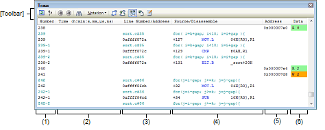This panel displays the trace data which has had an execution history of the program recorded in it (see "2.13 Collecting an Execution History").