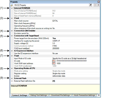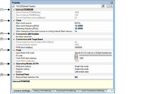 This property is expanded to display the file name, address range and download conditions as sub-properties. If no external flash definition files are registered, sub-properties other than File are not displayed.