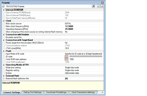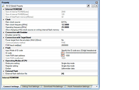 Note that the contents of the Property panel differ depending on the communication method (FINE communications [E1(Serial)] or JTAG communications [E1(JTAG)]) between E1 and the target system.