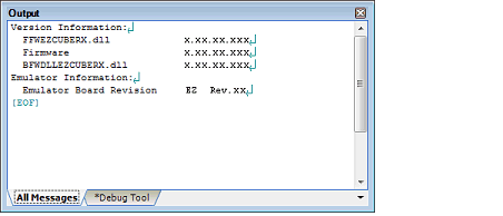 After successful connection to the debug tool, the version information such as the emulator firmware version and the emulator information such as supplied voltage are displayed on the Output panel.
