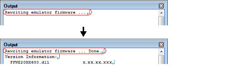 After emulator firmware updating is completed, the message on the Output panel changes as follows. |
