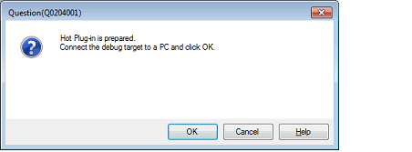 Following message will appear once you are ready to start hot plug-in connection. Connect the emulator to the target system and click [OK]. This will start the communication with the debug tool which is selected in the currently active project.