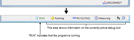 Once the connection to the debug tool is successfully completed, the Status bar on the Main window will change as shown below. For details on each item displayed on the Status bar, see the section of the "Main window".