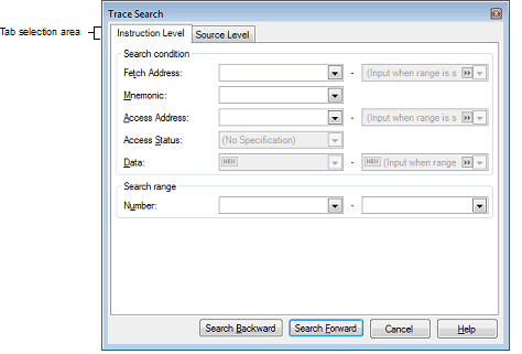 Note that by selecting the appropriate tab in this dialog box, you can choose to search for trace data at the instruction level or search at the source level.