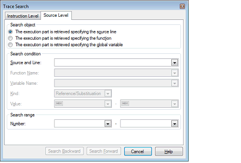 Select [The execution part is retrieved specifying the source line] in the [Search object] area, then perform the following operation.