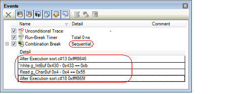 By setting more than one break event (execution-related and/or access-related) in combination, you can stop the program when the combination condition is satisfied by the set break event.