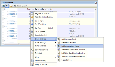 When you have performed this operation, it is interpreted as if a break event (execution-related) has been set at the target address, and it is managed in the Events panel (see "2.17 Event Management" for details). It is registered as "after execution" in the detailed information on the combination break in the Events panel.