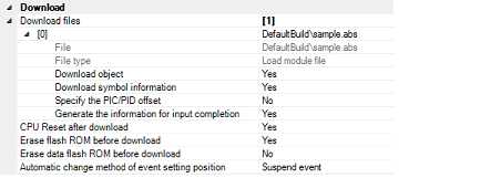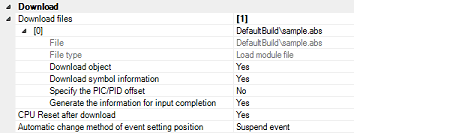 By default, CPU reset automatically occurs after downloading the file, and then the program is executed to the specified symbol position. If this operation above is not needed, specify [No] with both of the [CPU Reset after download] and [Execute to the specified symbol after CPU Reset] property.