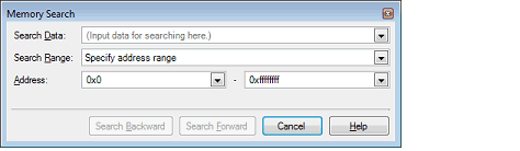 Specify the "start address - end address" to set the address range in which you want a memory value to be searched. Directly enter address expressions in the respective text boxes (specifiable in up to 1,024 characters) or select an input history item from the drop-down list (up to 10 history entries).