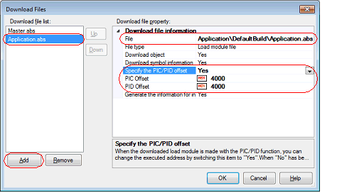 Click on the [Add] button in the [Download file list] area of the Download Files dialog box and set up information on the application load module in the [Download file property] area.