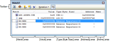 Up to four pieces of Watch panels can be opened at a time. Each panel is discriminated by the name "Watch1," "Watch2," "Watch3," and "Watch4" in the title bar. The respective Watch panels have their watch-expressions registered and managed individually and saved as user information for the project.