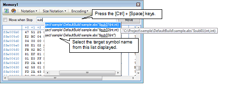 The list of symbol names appears by pressing the [Ctrl] + [Space] keys when a part of the target symbol name is being input in the text box that supports this function. In this list, double-click the target symbol name (or press the [Space]/[Enter] key after selecting it by using the [Up]/[Down] key) to complement the symbol name currently being input.