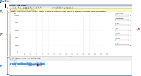 This area shows warning messages if there are inconsistencies between the conditions for measurement of current consumption and the conditions to be set before the debug tool is connected.
