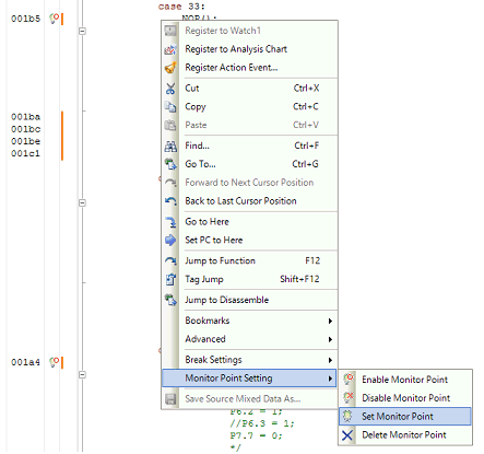 Monitoring points are set from [Monitor Point Setting] in the context menu after placing the cursor on the line of the target source code that was opened in the Editor panel.