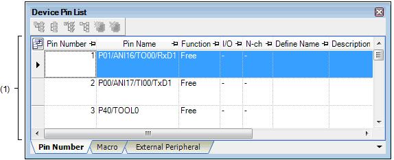 This area displays the “device pin list” for entering information on the pins of the microcontroller.