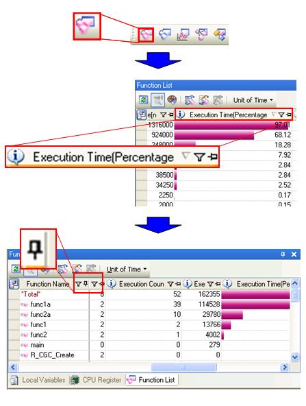 Click the [Function List Panel] button. The Function List panel opens. Sort the list by [Execution Time(Percentage)]. Also lock the display of the function-name column, so that the function names are visible. |
