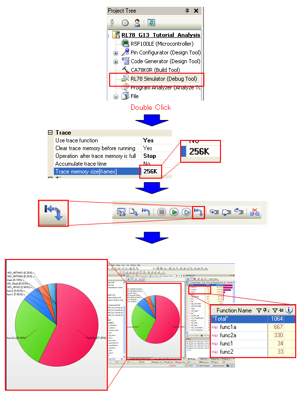 As shown in the figure below, in the debugging tool properties, change the "Trace memory size" setting to 12K ,and remove the breakpoint from inside the Main routine, and set the start and end points for tracing. |