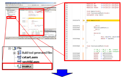 By registering a variable to the watch window, it is possible to display the value of that variable. In this section, you register a global variable called "wait" to the watch window and confirm that the value of the variable is incremented using a software break. The "wait" that is defined as a global variable which uses it as a timer use and counts up about 1 second (from H'0 to H'80000).