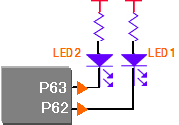 In this step, you decide which pins to use. Refer to the circuit diagram shown below. Bit 2 and bit 3 of the port 6 are used as outputs. In QB-R5F100LE-TB, these are connected to LED1 and LED2 respectively.