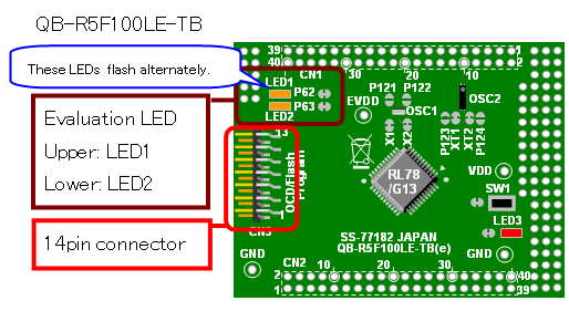 You are going to create a simple program which causes two LEDs flash alternately. See "Description of Sample Program" for details on this program.