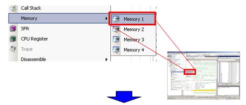 The Memory panel displays the state of memory. In this example, we display two of the four Memory panels. If [Memory 1] and [Memory 2] are displayed at the same time, they are tabbed by default, making it impossible to view the both panels at same time. Let's dock these two panels so that they can be viewed together.