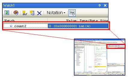 By registering a variable to the watch window, it is possible to display the value of that variable. In this section, you register a global variable called "count2" to the watch window and confirm that the value of the variable is incremented using a break point. The "count2" that is incremented every 500 milliseconds by using timer function is defined as a global variable.