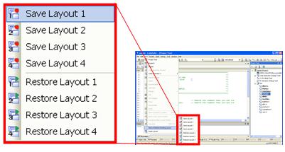 You can save up to four panel layout states for before and after connecting to the debugging tool. To do so, from the menu bar, select [View] > [Save or Restore Docking Layout].