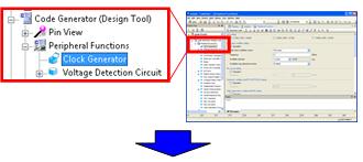 In this section, you configure the peripheral functions built in the microcontroller you are going to use. Using the code generation tool, a program can be automatically generated just by performing GUI operations such as selecting functions or entering numerical values.