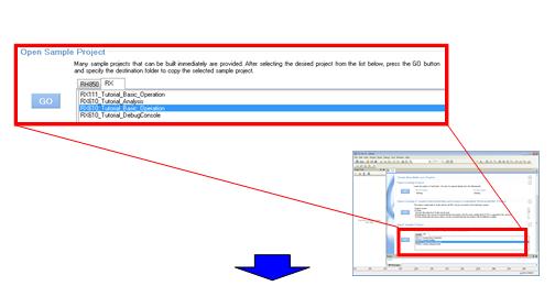 In the "Load Sample Project" field, from the "RX" tab, select "RX610_Tutorial_Basic_Operation", then click [GO].
